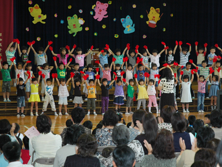学年ごとに約1カ月間練習してきた合奏や合唱をステージで披露。1年生はナイロンの黄色い腰みのをつけ、南国ムードで「アイアイ」を合唱。はっぴとねじり鉢巻きで登場した5年生は「ソーラン節〜ロック風」を元気に合奏した。