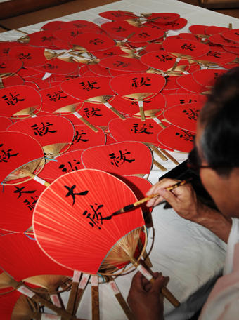 一本ずつうちわに文字を書き入れる生浪島堯宮司