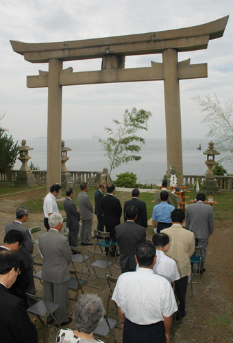 海を臨む鳥居前で観光協会、市など関係者約30人が神事。利用客の安全とにぎわいを祈った。