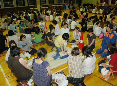 地区水泳で監視役を務める保護者を対象に、夏休み前に毎年実施。市内で行われる心肺蘇生講習会としては最大規模といい、市消防本部が同校体育館に人形とAED(自動体外式除細動器)12セットを持ち込み、職員と消防団員らが気道確保や心臓マッサージ、機器の取り扱い方法などを指導した。