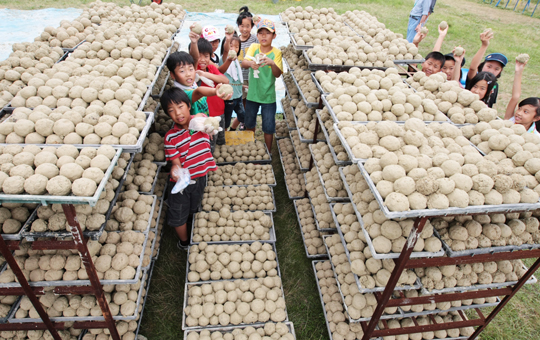 この日は材料になる土を約2トン用意。環境学習として3、4年生児童保護者、老人会、婦人会など総勢300人近い参加者が約1時間かけて作業し、ソフトボール大の団子を約1万個作り上げた。