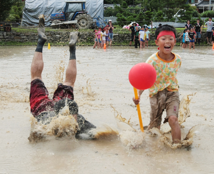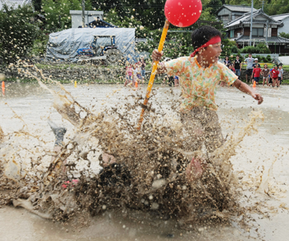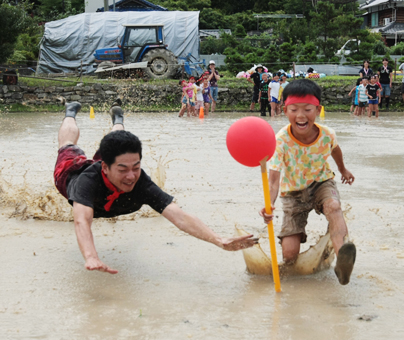 田端地区の山本薫さん(74)が約10アールの水田を代かきして提供。子どもたちは服の下に水着を着て田んぼへ入り、二人三脚やドッジボールなど7種目をグループ対抗で競技した。