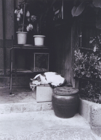 いずれも昔懐かしい風情が残る尾崎地区の街角を撮ったモノクロ写真。昼寝のネコがたたずむ民家の軒先など、ノスタルジックな作品が並ぶ。
