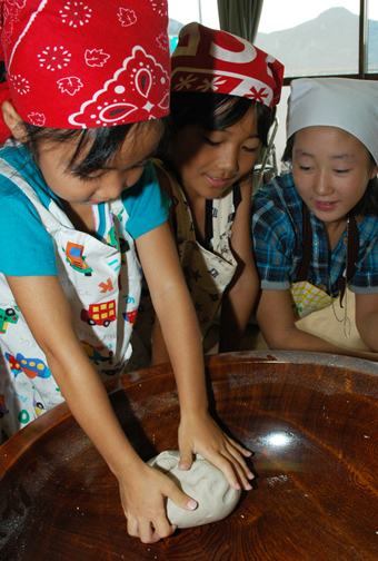 体験教室では同市場のスタッフ4人が講師となり、生地の練り方を指導。小麦粉を3割加えたそば粉に水を加えて塊にし、麺棒で薄く延ばした。