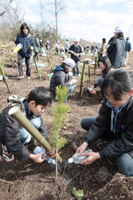 児童らはまず、海から流れ着いたゴミを拾い集めて植樹場所を清掃。1・5メートル間隔に地面を掘って施肥したところに一本一本手植し、竹の添え木を掛矢で力いっぱい打ち込んだ。およそ1時間かけて約60メートル区間に3〜4列を整備した。