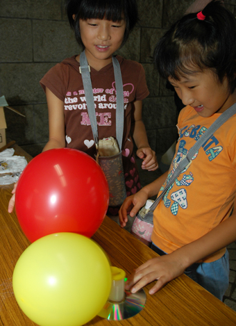 風船とCDで組み立てるホバークラフトは風船から噴き出す空気圧でCDと接地面の摩擦を減らす仕組み。軽く押してやるだけで機体が机の上を滑るように動いた。