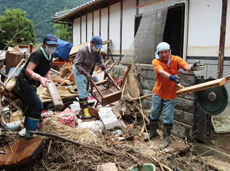 寺田理事長ら有志12人が午前9時に現地入り。同町東徳久の南光地域福祉センターに設置されたボランティアセンターの指示で同町久崎地区へ派遣された。メンバーらは茶色い土砂で埋め尽くされた田や洪水で押し流された車を横目にしながら、割当てられた民家4軒を手分けし、水浸しになった畳やタンス、土砂などを民家から搬出した。