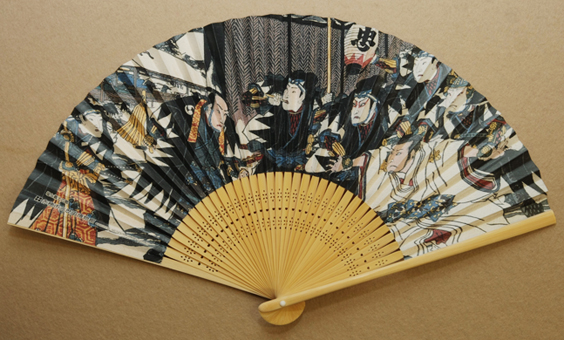 意匠に使用したのは、歌川国貞(後に三代豊国)が手がけた12枚揃の大判錦絵「仮名手本忠臣蔵全十一段」の11段目。長さ7寸5分の紳士用扇子を開くと、左側に大星由良之助と力弥、右側に師直を配した討ち入りの場面が広がる。