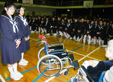 同校体育館で行われた贈呈式には、利用者代表の七村百子さん(85)が昨年度に贈られた車椅子に乗って出席。「皆さんが一生懸命、集めて購入してくれた車椅子を大切に使わせてもらいます」と感激で声を震わせた。