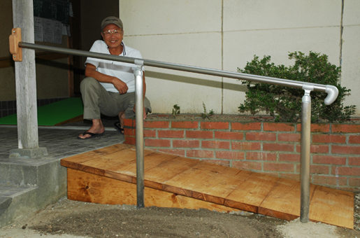 同集会所は昭和51年築。当時は公共施設にスロープ設置を義務付ける県条例がなく、玄関前とポーチにそれぞれ高さ15−30センチの段差があった。選挙の投票などで車いすの人が来所した場合は4人で抱え上げていたという。