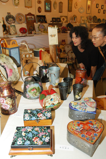 トールペイント教室「Rose Garden」(中土井まゆみ代表)の会員約20人が出品。トールペイントで好まれるバラの図柄を描いた小物入れ、プレートなど約200点の力作が並ぶ。