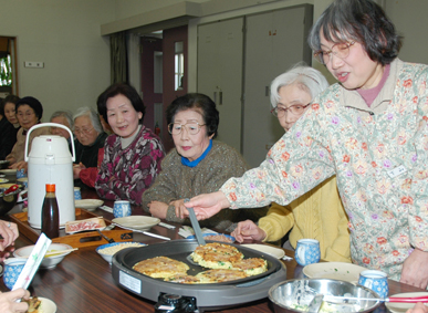 講話の後はみんなでお好み焼きパーティー。香ばしいソースの香りとともに参加者の笑顔が広がった。