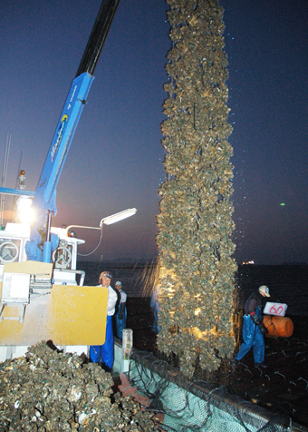 15日は日の出前の午前5時から漁協組合員ら約50人が漁船15隻で沖合いに浮かぶ養殖いかだへ。クレーンで海中のロープを引き揚げると、海の栄養をたっぷり吸収したカキが鈴なりで姿を現した。