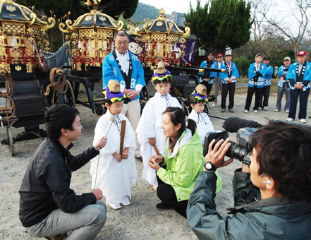 中継は有年保育所横の御旅所前に東有年八幡神社の秋季例祭で使うみこし3基を並べて行われた。自治会長の谷山甫さん(67)が祭礼についてインタビューに答え、11日にあった祭で頭人を務めた岡本慈棋君(5)ら子どもたちも衣装を着て出演。有線放送で集まった地域住民約100人が見守った。