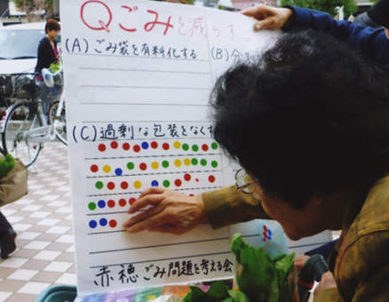意識調査は「私たち市民の気持ちを目に見える形にするため」に発案した。25日までに市内のスーパー2カ所で1回ずつ実施し、計210枚の回答を得た。その結果、約6割が「過剰包装の廃止」、4割近くが「分別の徹底」を選び、「有料化」に貼られたシールは5枚にとどまった。同時に行った「ごみ処理有料化計画の撤回を求める請願署名」は約370筆が集まった。