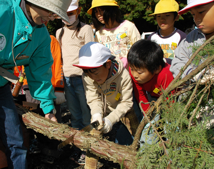 「間伐によって森に光が入り、草が生え、雨が降っても地崩れが起きにくくなる」と学んだ児童らは間伐作業に挑戦。育ちが悪かった高さ約4メートルのヒノキをノコギリで伐採し、別の場所にコナラ、シリブカガシの苗を植樹した。