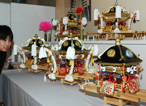 播磨各地の祭りで目にした屋台を約10分の1の大きさに再現。細かな彫刻を施した屋根下の狭間、アクセサリーを代用した飾り金具などに苦労と工夫がうかがえる。