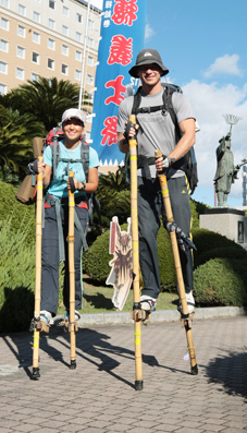 今年7月1日に北海道の宗谷岬を出発した。急な階段など足場が危険なところ以外は竹馬に乗り、一日平均15キロを南下。鹿児島県の佐多岬まで約3000キロの踏破を目指す。