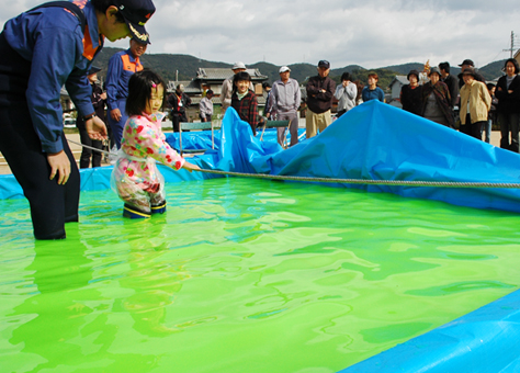 深さ約30センチの仮設プールを2面用意。入浴剤で濁らせた水にブロックを沈め、障害物を避けて歩く訓練を行った。もう一面では、ポンプで水流を起こし、抵抗に逆らって進む難しさを体験。身長の低い子どもは特に苦労していた。