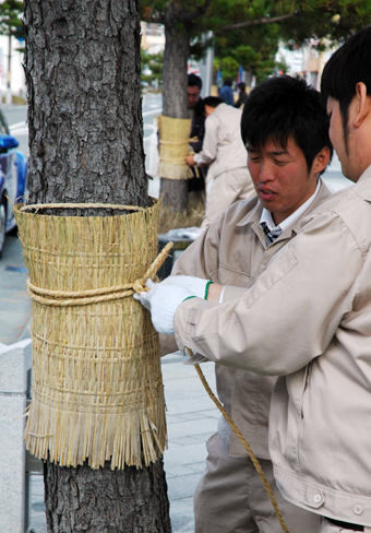 市土木課職員が3班で作業。根元から1メートルほどの高さを目安に、45センチ幅に編んだわらを幹に巻きつけて縄で結んだ。クロマツ約50本のほか、「いきつぎ広場」のソメイヨシノ5本にも取り付けた。