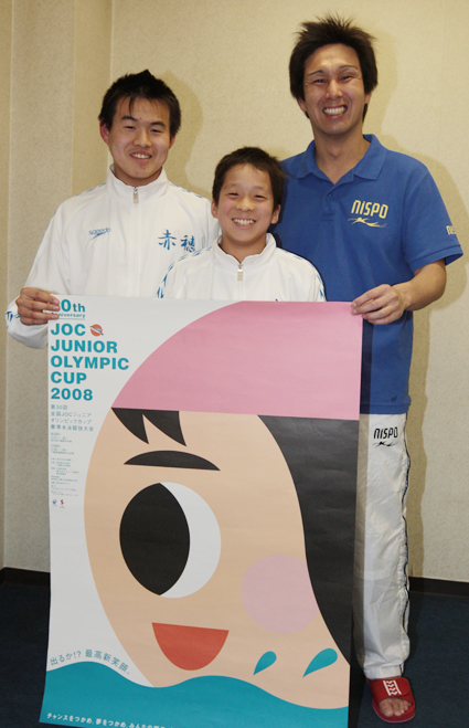 参加標準記録を突破し、全国JOC水泳に出場する村澤選手(左)と奥田選手。右は中田コーチ