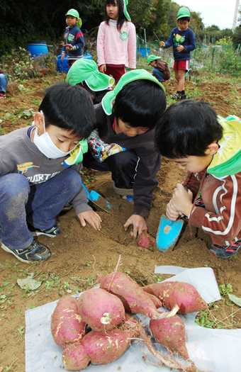 加里屋の関西電力赤穂発電所が構内の菜園約40平方メートルを提供。園児らが今年6月に植えた鳴門金時を掘り出した。