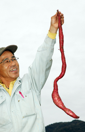 大津にある宮本さんの畑に今年7月に植えた鳴門金時。そのうち1本が地面をはうように実った。長さは約70センチで、まるで自然薯のよう。