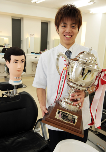 全国理容美容学生技術大会で初代グランプリに輝いた山本竜也さん=大阪市中央区の高津理容美容専門学校で