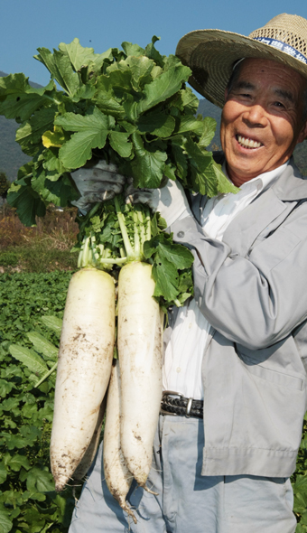 「大津年輪の会」(旧林茂存代表)が畑約45アールで栽培した青首ダイコンの「秋明」。9月上旬に種をまき、長さ30−40センチに育った。