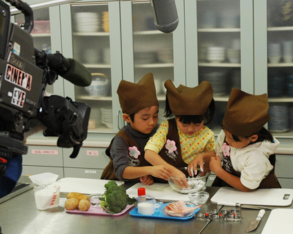 テレビカメラの前で調理する子どもたち