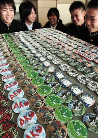 今年もデザインを生徒から公募。5人から9種類が寄せられ、昨年の6種類と合わせて計15デザインになった。1、2年生各クラスの代表が放課後に集まり、カラープリントした絵柄をスチール製の土台(直径6センチ)にプレス。延べ12日間で予定個数が完成した。