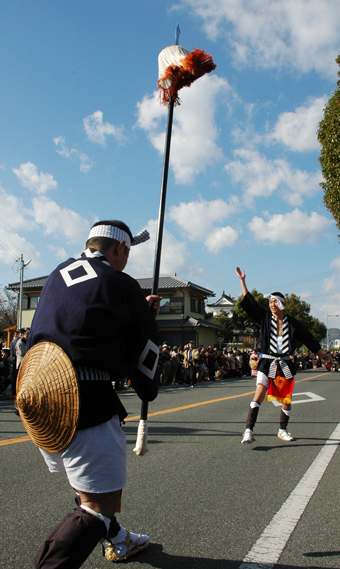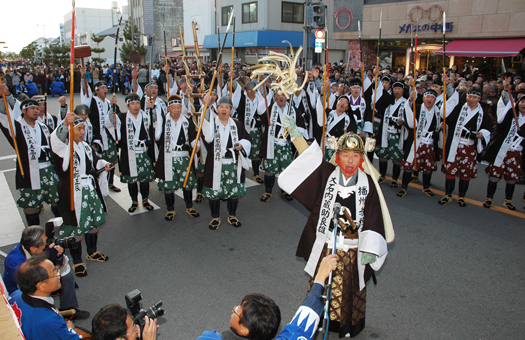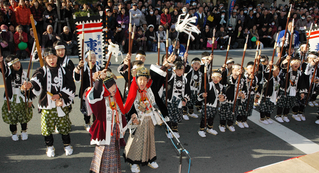 メーンの義士行列は御崎自治会連合会に一般公募参加者を加えた構成。大石内蔵助役の村下龍彦会長が鳴らす陣太鼓の音に合わせて歩を進め、本部前で「エイ、エイ、オー」と勝どきを上げた。
