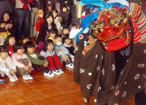 白木仁一朗ちゃん(5)は獅子頭をかぶり、遊戯室を一周。「大きな口からみんなが見えた」とうれしそうに話した。