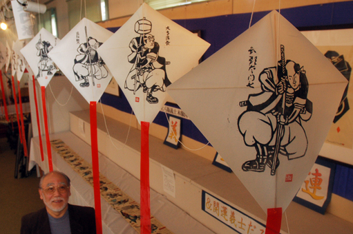 作ったのは、一昨年の夏に「義士風鈴」を考案するなど自作の義士版画を活用した作品を手がける元塩町の版画家、佐野正幸さん(69)。江戸後期の浮世絵「誠忠義士四十七個之像」を参考に彫った義士一人ずつの木版画47点を障子紙に単色刷りし、縦横約40センチのひし形凧に仕立てた。