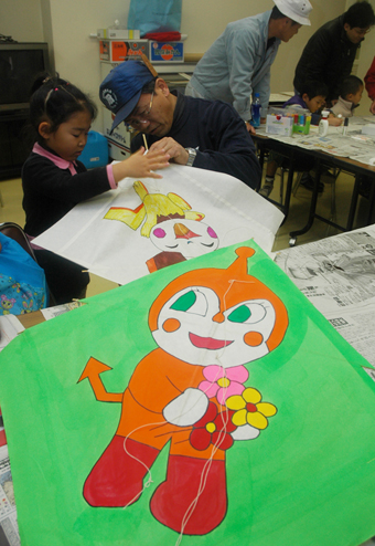 主催の凧愛好家グループ「赤穂大空会」(西濱正行会長)がアニメキャラクターの線画をプリントした和紙を用意し、参加の子どもたちがマジックで塗り絵。竹ひごを接着剤で和紙に貼りつけた。