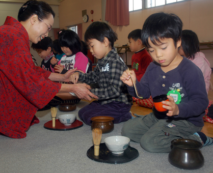 日本の伝統文化に触れて豊かな感性を育もうと、昨年6月から茶道の初歩を学習。道具の名称や扱い方を学んだ。お茶会は締めくくりとして開かれ、昨秋の親子陶芸教室で作ったお茶碗で子どもたちが抹茶を立てた。