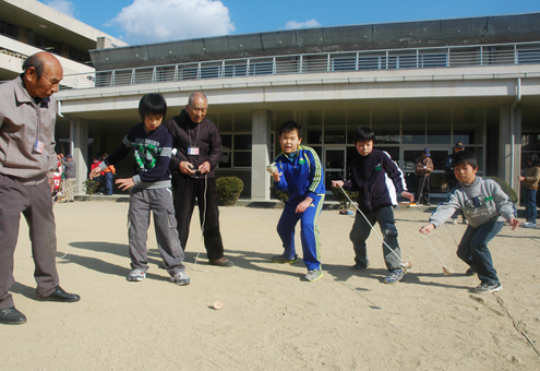 地域の高齢者らと昔遊びを楽しむ児童たち