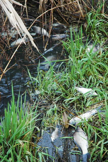 浮いていた魚はすべてフナでその数は目視できたものだけでも150匹以上。完全に死んでいるものよりも瀕死の状態の方が目につく。北側約200メートルの区間では水面に油膜が見えた。キャンプ場職員によると、12日までは特に異状はなかったらしい。