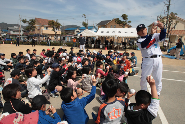 山田さんは「プロ野球選手になるにはきちんとキャッチボールができることが絶対条件」と基本の大切さを語りかけ、佐々木さんとともにボールの握り方や投げ方を実演した。