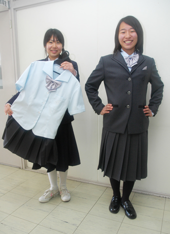被服科授業の一環で一昨年夏に生徒からデザインを公募。興味を持った他科の生徒からも応募があり、夏服と合わせて約100点が集った。並行して全校生徒にアンケートを実施し、「リボンを付けてほしい」「家でも洗える素材に」などの要望が寄せられた。