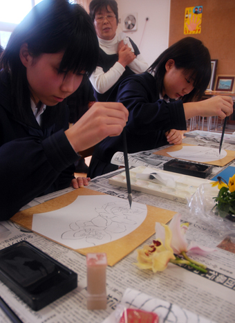 尾崎の絵手紙講師、稲家みどりさんら4人が手ほどき。青墨で輪郭を描き、顔彩で着色した。絵手紙は下書きなしで描くため、生徒らは筆先に意識を集中。絵の横に「夢をかなえてサクラ咲け」「走り貫き通す」「失敗を恐れず進もう自分の道へ」など卒業後の抱負を書き入れた。