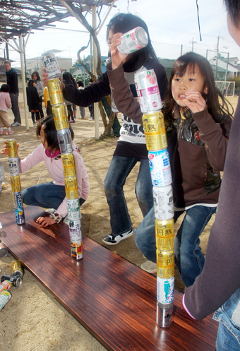 どのゲームも楽しそうで迷ったという2年生の坂本えりさん(7)は「空き缶積みで6個も積めたよ」とにっこり。各競技の成績優秀者には後日“認定証”が渡されるという。