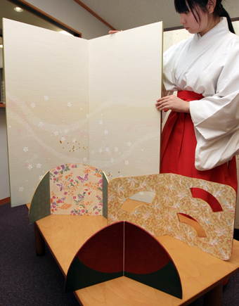 「日本のすぐれたものづくり技法を紹介したい」と同神社が10数点を展示。いずれも表裏異なる柄の千代紙、ふすま紙が貼られ、1帖で2種類の意匠が楽しめる。