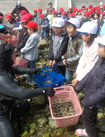 ボランティアダイバーにアマモ苗を手渡す児童たち