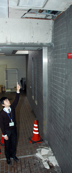 雨漏りによる劣化で落ちたとみられる赤穂市役所地下駐車場通用口の天井