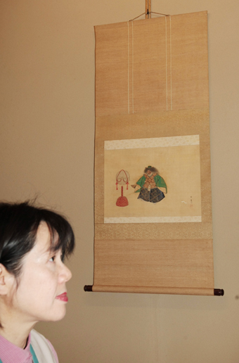 特別展示されている作品は能の演目「松山鏡」の一場面を描いた掛け軸。繊細な線画が百年の特徴をよく表している。同館によると、百年が能画を描いたものはこの他に確認されておらず貴重。能面展にちなみ、所有者から特別に借り受けたという。