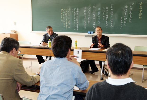 「どう見るべきか、赤穂市の財政とまちづくり」と題し、大阪自治体問題研究所理事の初村尤而氏(63)が講演。昭和60年度以降の経常収支比率、普通会計決算などを見ながら、赤穂市の財政状況を確認した。