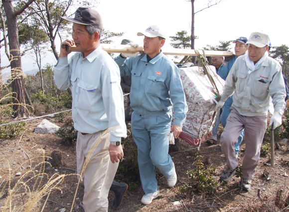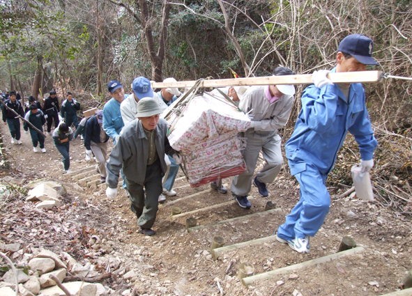 記録台は自治会員の手作り。重さ40キロほどある頑丈な造りで、大人10数人が4人ずつ交替で担ぎ、山頂まで運び上げた。