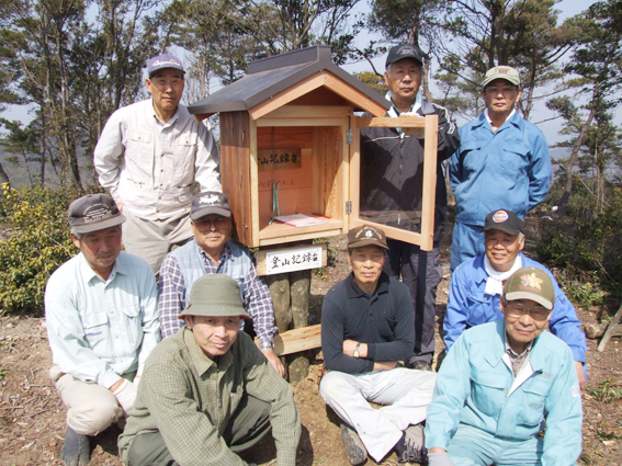 最高点のすぐそばには登頂者が氏名などを記帳する「登山記録台」を設置。マツとスギで作った収納箱の中に記帳用ノートと筆記用具を納めた。