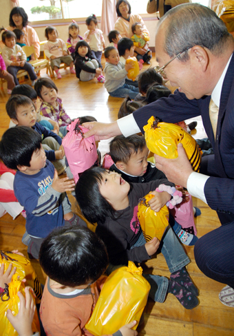 赤穂保育所では園児89人がタンバリンや木琴を演奏し、歌で歓迎。豆田正明市長と中山茂雄理事長が「お友だちと仲良く元気に遊んでね」とお菓子の入った袋を一人ひとりに手渡した。子どもたちは「ありがとう」と受け取り、「何が入っているかな」と中身を楽しみにしていた。